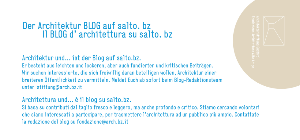 Die Architekturstiftung Südtirol versucht vermehrt, die Bevölkerung des Landes für das Thema „Baukultur“ zu sensibilisieren. Das Ziel liegt darin, eine offene Diskussionsplattform zu schaffen, dabei die Bevölkerung zur Sprache kommen zu lassen, Berüh- rungsängste abzubauen und gleich-zeitig die Architektur zu erklären.