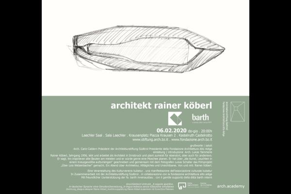 Er sagt, ihn inspirieren alte Bauten am meisten und er würde gerne eine Moschee planen. Er hat über „die Kunst, Leuchten in einem Kreuzgewölbe aufzuhängen“ geschrieben und gemeinsam mit dem Fotografen Lukas Schaller das Filmprojekt „Über Lois Welzenbacher“ gemacht. Ein Abend über Architektur, Alltägliches und Unsichtbares. Von und mit: Rainer Köberl.