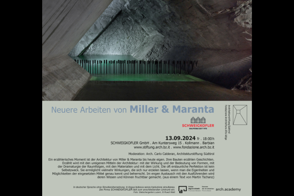 Ein erzählerisches Moment ist der Architektur von Miller & Maranta bis heute eigen. Ihre Bauten erzählen Geschichten. Die Themen sind jene der jeweiligen Orte. «Bauen ist Weiterbauen»: dieser Aphorismus des Soziologen, Kritikers und Pädagogen Lucius Burckhardt ist bei Miller & Maranta selbst dort gültig, wo wir es vordergründig mit selbständigen Solitären zu tun haben. Erzählt wird mit den ureigenen Mitteln der Architektur: mit der Wirkung und der Bedeutung von Formen, mit der Dramaturgie der Raumfolgen, mit den Materialien und mit dem Licht. Die oft erstaunliche Perfektion ist kein Selbstzweck. Sie ermöglicht vielmehr Wirkungen, die sich nur erzielen lassen, wenn man die Eigenheiten und Möglichkeiten der eingesetzten Mittel genau kennt und beherrscht. Im engen Austausch mit den Ausführenden wird deren Wissen und Können fruchtbar gemacht. (aus einem Text von Text Martin Tschanz)