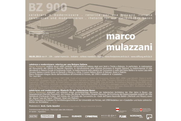 Marco Mulazzani analysiert und erläutert einige symbolträchtige Bauwerke der italienischen Architektur der 20er Jahre in Bozen: das Siegesdenkmal (Marcello Piacentini), den Umbau des Bozner Bahnhofes (Angiolo Mazzoni), die Errichtung des Regierungspalais anstelle der Villa Wendlandt (Ferdinando Forlati), den Umbau der Turnhalle des Turnvereins zur »Sede dell’Opera Nazionale Balilla« (Mansutti und Miozzo) sowie die „Nuova Casa del Fascio“ (Pelizzari, Rossi und Plattner).