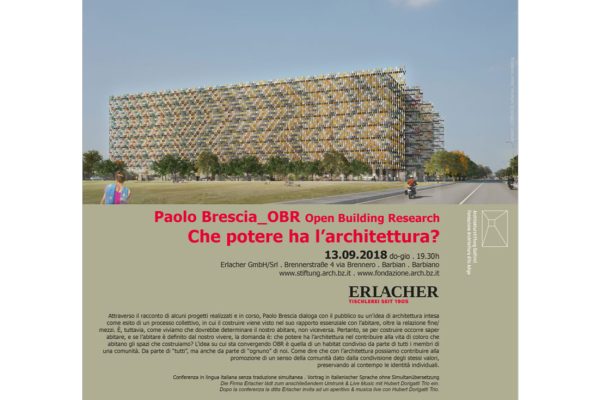 Attraverso il racconto di alcuni progetti realizzati e in corso, Paolo Brescia dialoga con il pubblico su un’idea di architettura intesa come esito di un processo collettivo, in cui il costruire viene visto nel suo rapporto essenziale con l’abitare, oltre la relazione fie/mezzi. È, tuttavia, come viviamo che dovrebbe determinare il nostro abitare, non viceversa. Pertanto, se per costruire occorre saper abitare, e se l’abitare è defiito dal nostro vivere, la domanda è: che potere ha l’architettura nel contribuire alla vita di coloro che abitano gli spazi che costruiamo? L’idea su cui sta convergendo OBR è quella di un habitat condiviso da parte di tutti i membri di una comunità. Da parte di “tutti”, ma anche da parte di “ognuno” di noi. Come dire che con l’architettura possiamo contribuire alla promozione di un senso della comunità dato dalla condivisione degli stessi valori, preservando al contempo le identità individuali.