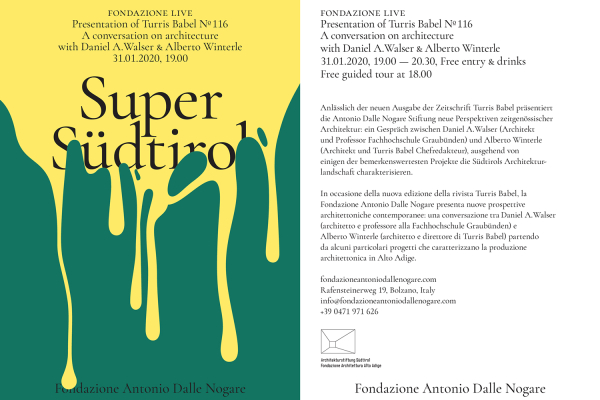 Anlässlich der neuen Ausgabe der Zeitschrift Turris Babel werden, in Zusammenarbeit mit der Antonio Dalle Nogare Stiftung, neue Perspektiven zeitgenössischer Architektur präsentiert: ein Gespräch zwischen Daniel A. Walser (Architekt und Professor Fachhochschule Graubünden) und Alberto Winterle (Architekt und Turris Babel Chefredakteur), ausgehend von einigen der bemerkenswertesten Projekte die Südtirols Architekturlandschaftcharakterisieren.