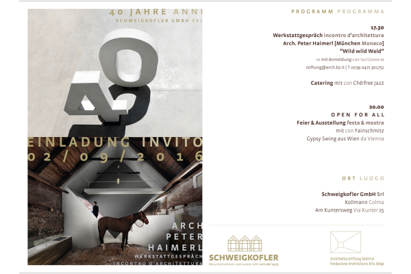Schwungvolle Musik, eine Fotoausstellung, die Begegnung mit einem renommierten Architekten und viel Raum zum Feiern: Zu dieser Verbindung aus Kultur, Architektur und Genuss, lädt das Bauunternehmen Schweigkofler GmbH aus Kollmann, anlässlich seines 40-Jahr-Jubiläums, in Zusammenarbeit mit der Architekturstiftung Südtirol, am Freitag, 2. September am Unternehmenssitz in Kollmann.